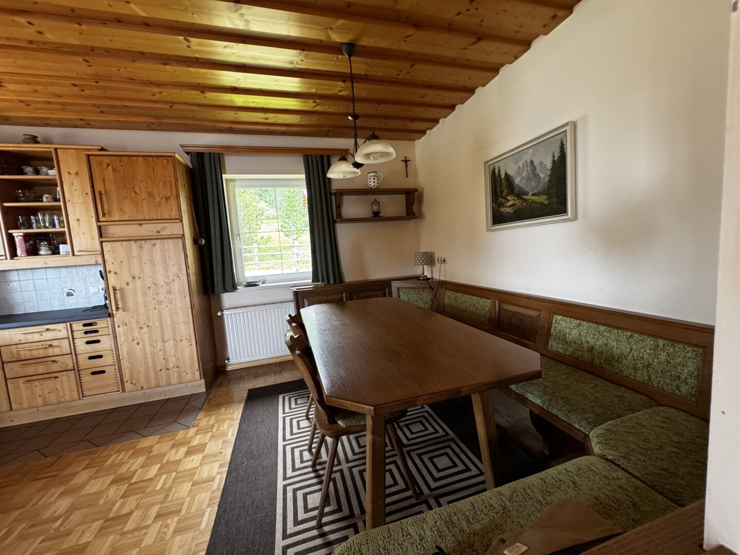 * Wohn-Essbereich mit Küchenzeile, Kachelofen
