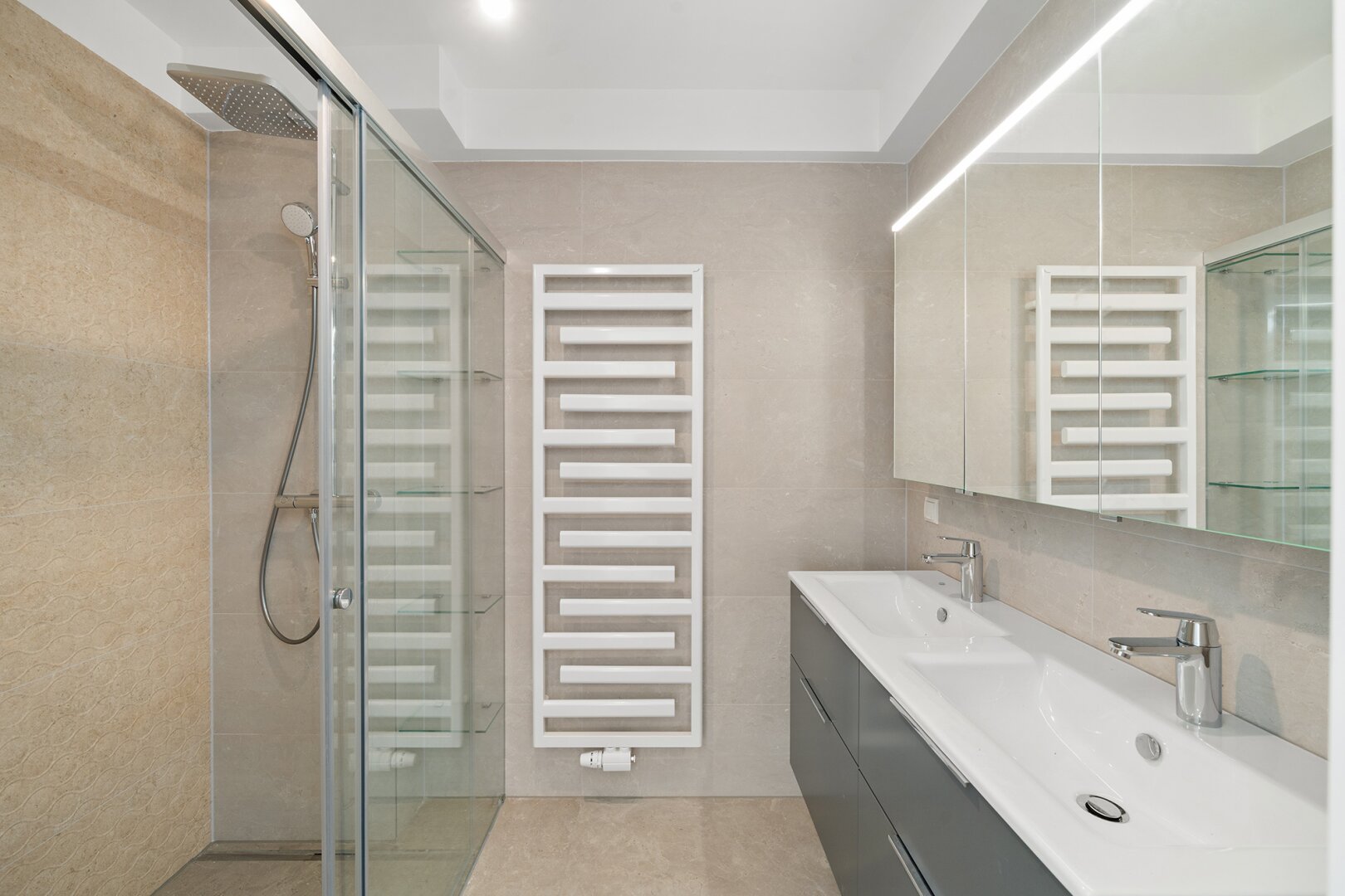 * ein Bad mit Dusche und Doppelwaschbecken inkl. Badezimmermöbel