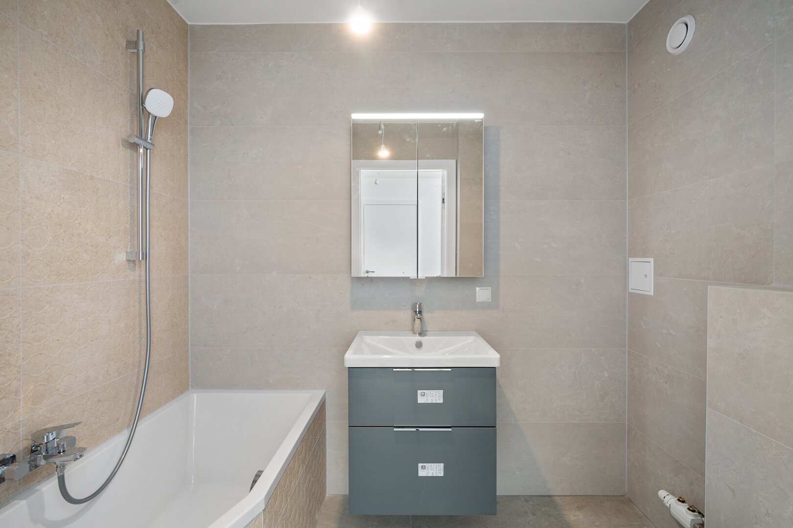 * ein Bad mit Badewanne, Waschbecken und WC inkl. Badezimmermöbel