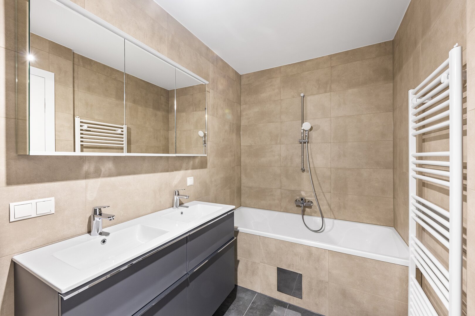 * ein Bad mit Dusche und Doppelwaschbecken inkl. Badezimmermöbel.