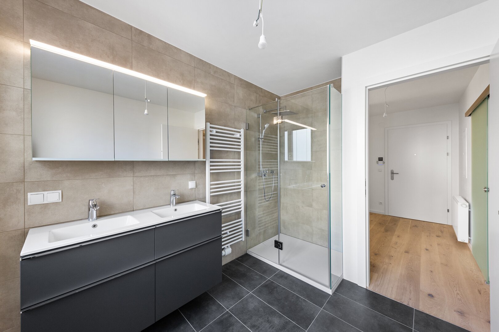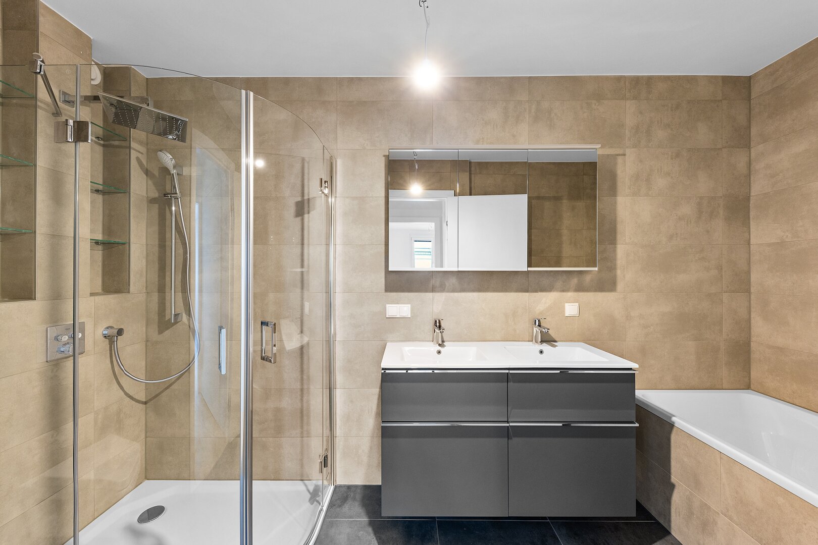* ein Bad mit Dusche und Doppelwaschbecken inkl. Badezimmermöbel.